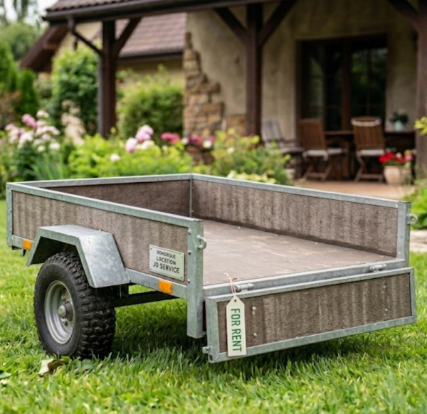 Remorque pratique pour transporter déchets verts, matériaux, outils ou équipements lors de travaux de jardinage ou de bricolage.