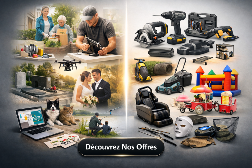 Découvrez l’ensemble de nos solutions de location adaptées à vos besoins du quotidien, de vos travaux et de vos événements. Nous proposons un large choix de matériel de bricolage (perceuse, visseuse, disqueuse, scie sauteuse, bétonnière, outillage manuel…), ainsi que du matériel complet de jardinage (tondeuse, taille-haie, tronçonneuse, Karcher, remorque, outils à main…). Pour vos fêtes et animations, retrouvez également notre matériel événementiel : châteaux et jeux gonflables, manèges et jeux à monnayeur, mascottes, machines à barbe à papa ou pop-corn avec chariot, et bien plus encore. Nous mettons aussi à disposition du matériel bien-être et relaxation, avec sièges massants connectés, plateformes vibrantes, accessoires de massage, ainsi que des équipements de luminothérapie (lunettes, masques et lampes). Enfin, les passionnés de nature pourront louer du matériel de pêche complet : cannes au coup et au lancer montées, équipements pour carpe et carnassiers, épuisettes, bourriches et divers accessoires. Retrouvez ci-dessous le détail de nos tarifs pour chaque catégorie de matériel.